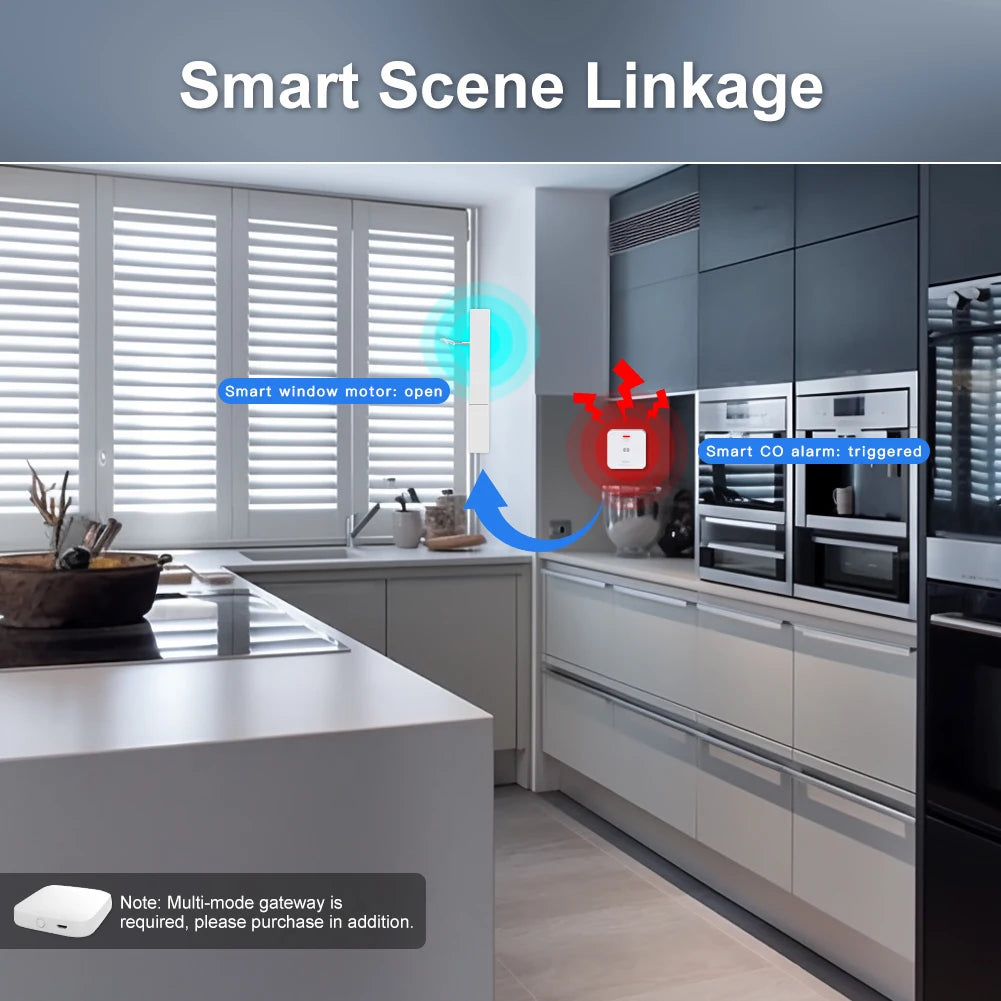 Set smart linkage between carbon monoxide alarm and window motor. When the CO concentration reaches dangerous level, the window is set to open automatically.