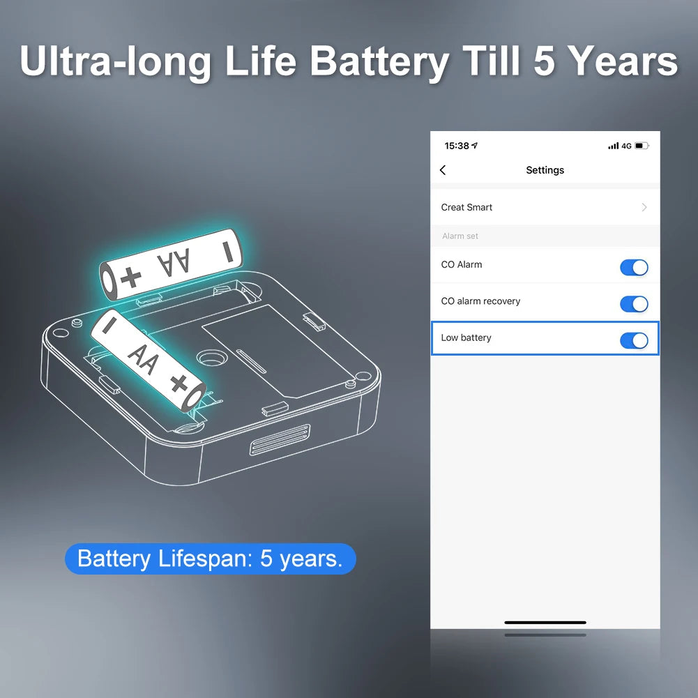 No worry about replacing batteries frequently since the AA battery lifespan is up to 5 years, added with low battery reminder to guarantee its continuous operation.