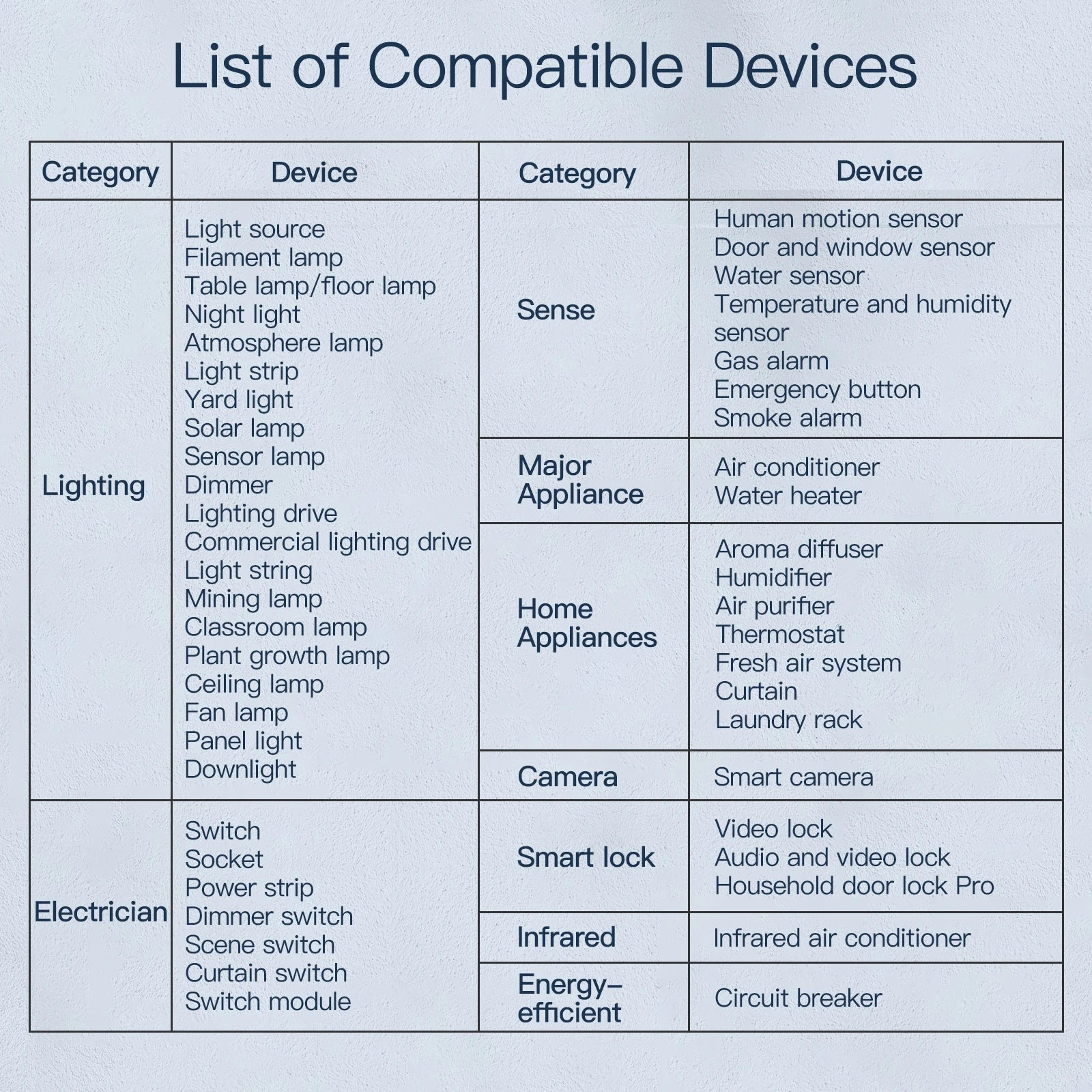 The panel, compatible with over 410000 of Tuya eco products, can control up to 20 kinds of products, and add 100+ devices in, to satisfy your needs with one click to experience multi-scene smart life.