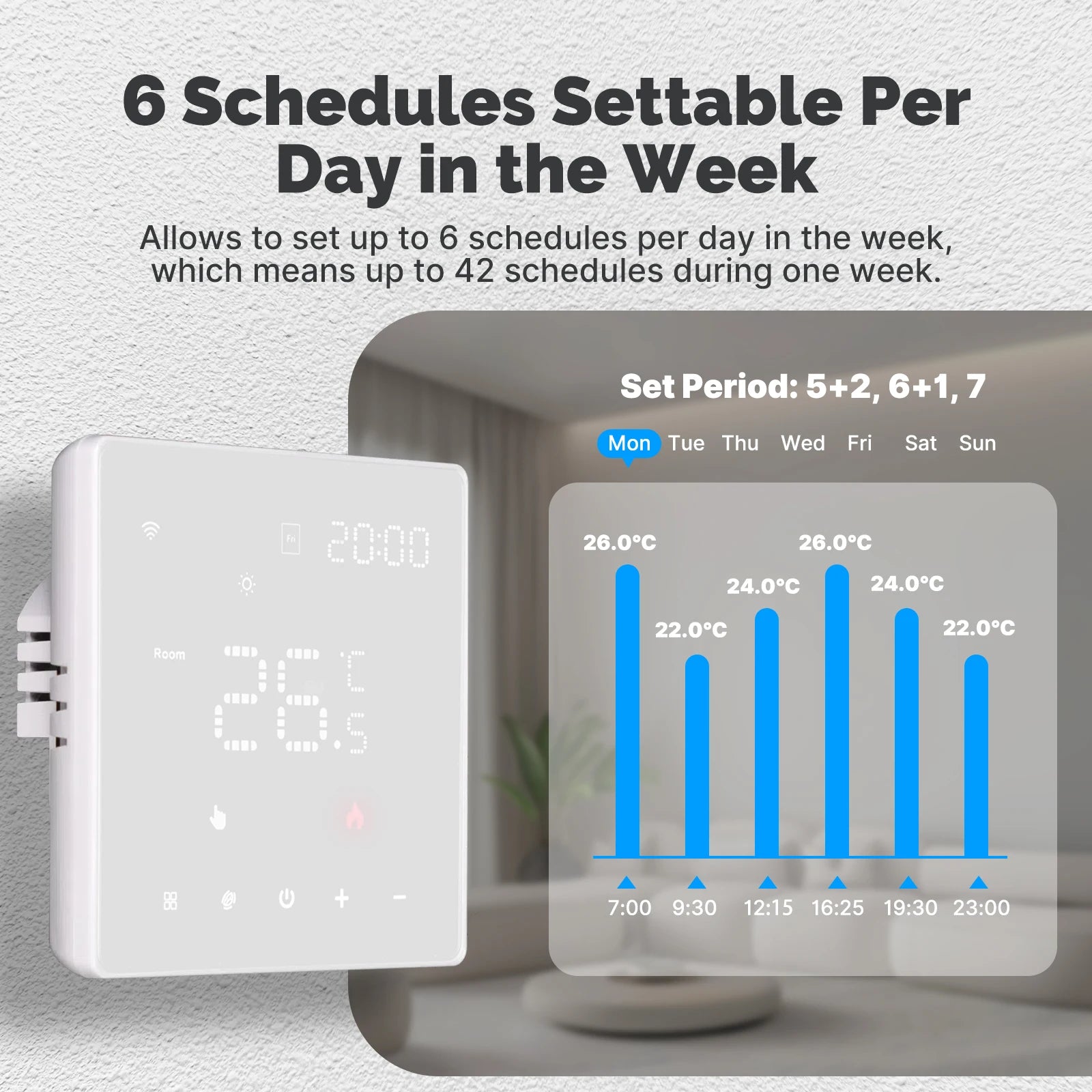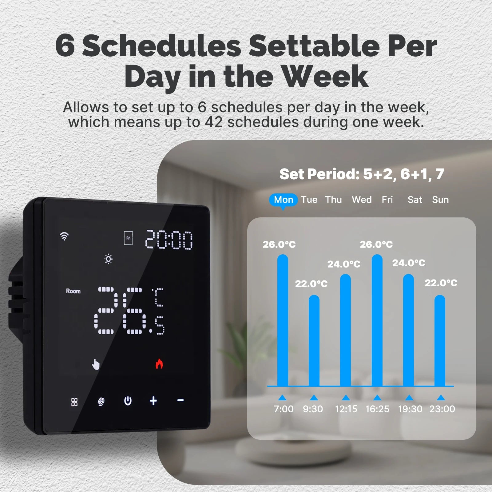 Allows to set up to 6 schedules per day in the week which means up to 42 schedules during one week.