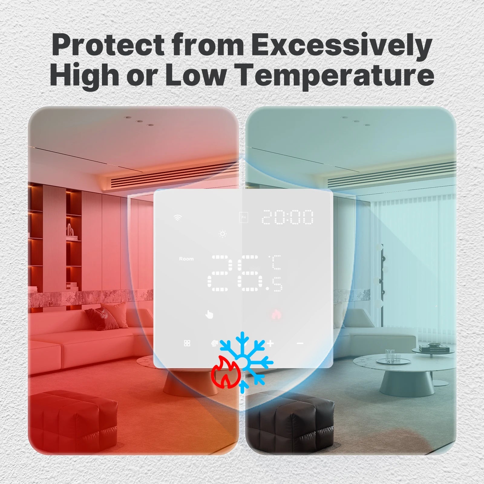 When the thermostat is in the shutdown state and the indoor temperature is lower than 5 C, the thermostat automatically turns on heating (the screen displays the"antifreeze icon"); When the room temperature rises to 7 ℃ the thermostat automatically turns off the heating (the screen disappears). This feature is only applicable to electric heating.