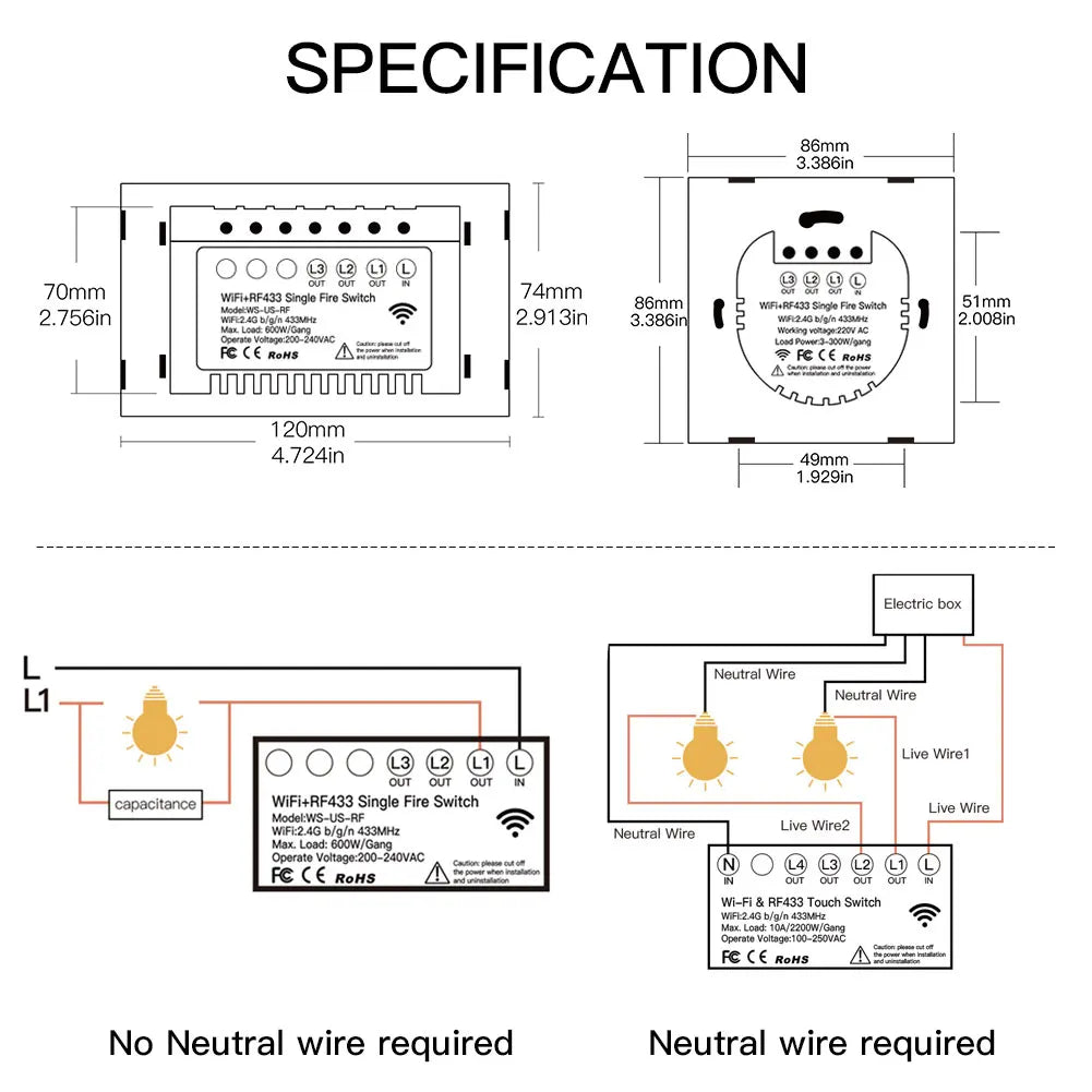 NOTE: Neutral wire optional,can choose neutral wire and live wire switch,or choose only live wire switch.