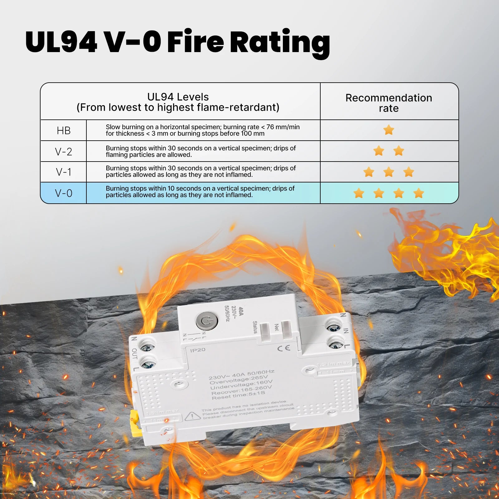 UL94 V-0 rated flame retardant housing for superior fire protection.